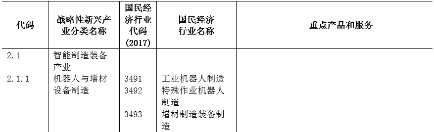 分类包括:新一代信息技术产业、高端装备制造产业、新材料产业、生物产业、新能源汽车产业、新能源产业、节能环保产业、数字创意产业、相关服务业等9大领域。其中高端装备制造产业,新材料产业,数字创意技术设备制造,相关服务业四大领域包含增材制造(3D打印);其中高端装备制造产业领域的智能制造装备产业的机器人与增材设备制造版块包含增材制造装备制造;新材料产业领域的前沿新材料版块包含金属增材制造专用材料制造、非金属增材制造专用材料制造、医用增材制造专用材料制造;数字创意产业领域的工业设计服务版块包含3D打印等领域工业设计;相关服务业领域的其他技术推广服务包含三维(3D)打印技术推广服务。而且这些内容均为新添信息,详细内容如下。