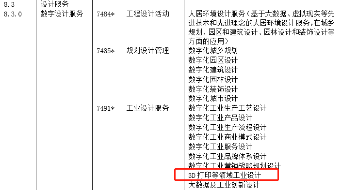 数字创意产业领域的工业设计服务版块包含3D打印等领域工业设计