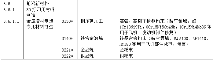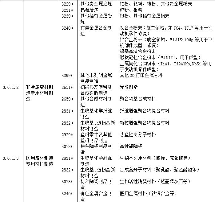 新材料产业领域的前沿新材料版块包含金属增材制造专用材料制造、非金属增材制造专用材料制造、医用增材制造专用材料制造