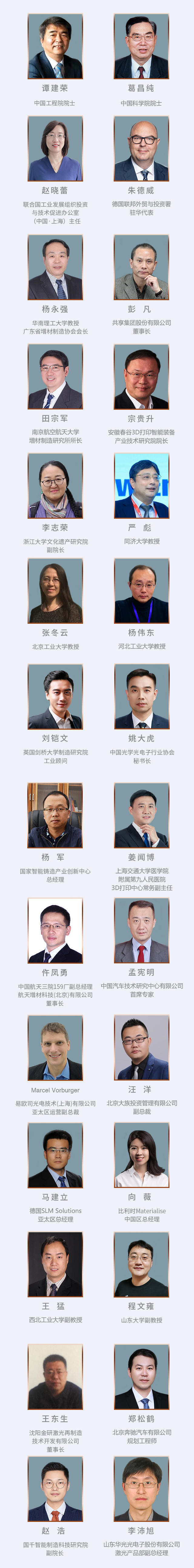 来自中国工程院、中国科学院、国家增材制造产品质量监督检验中心、广东省增材制造协会、上海市增材制造协会、四川省增材制造技术协会、清华大学、浙江大学、同济大学、南京航空航天大学、西北工业大学、北京工业大学、华南理工大学、上海交通大学医学院附属第九人民医院、上海科技大学、合肥工业大学、安徽建筑大学、昆明理工大学、河北科技大学、中国航天三院159厂、共享集团股份有限公司、核动力研究设计院以及联合国工业发展组织、德国联邦外贸与投资署、英国剑桥大学制造研究院、德国EOS、德国SLM Solutions、比利时Materialise、达索系统、日挥控股株式会社的国内外行业专家及企业代表将出席本次论坛。